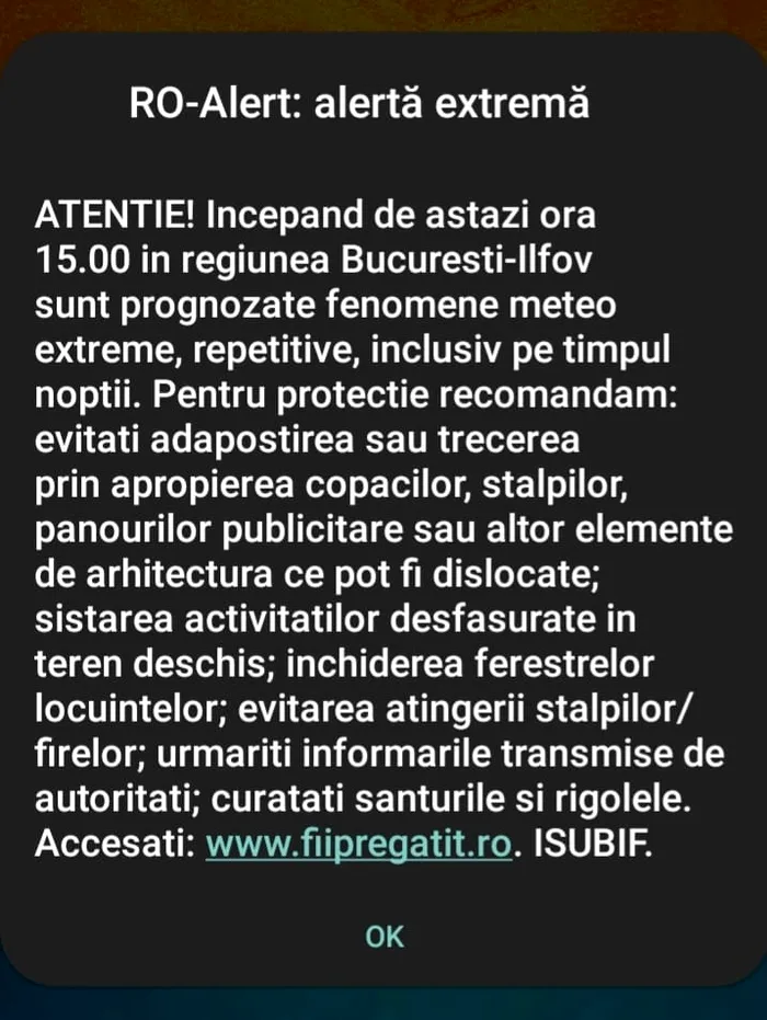 Mesajul vine în contextul unei avertizări meteorologice Cod portocaliu, valabilă până mâine, ora 10:00.