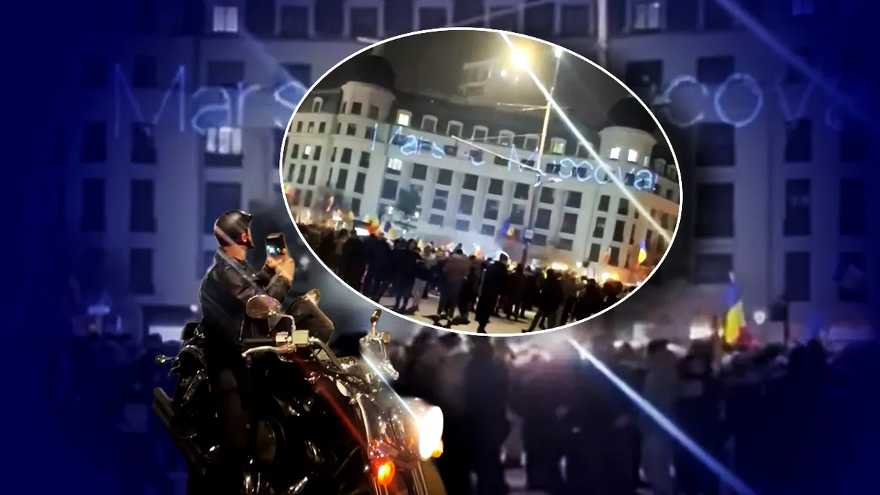 „În contextul adunării publice din data de 15.01.2025, din Piața Universității, pe timpul deplasării manifestanților, un bărbat a proiectat un mesaj pe o clădire, stârnind indignarea celorlalți participanți la adunarea publică.
