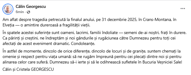 În postarea publicată pe rețelele sociale, Călin Georgescu și-a adresat gândurile bune și rugăciunile către familiile afectate de incendiul de la barul din stațiunea Crans-Montana, din Elveția. Acesta a făcut și un apel la solidaritate și respect pentru viața umană și spune că „dincolo de locuri și de granițe, suntem chemați la omenie și respect”.