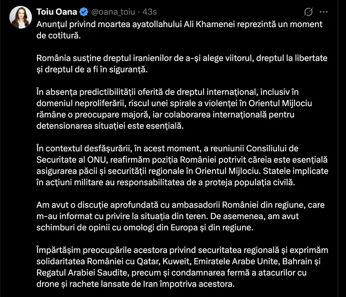 „Anunțul privind moartea ayatollahului Ali Khamenei reprezintă un moment de cotitură. România susține dreptul iranienilor de a-și alege viitorul, dreptul la libertate și dreptul de a fi în siguranță. În absența predictibilității oferită de dreptul internațional, inclusiv în domeniul neproliferării, riscul unei spirale a violenței în Orientul Mijlociu rămâne o preocupare majoră, iar colaborarea internațională pentru detensionarea situației este esențială”, a scris Țoiu.