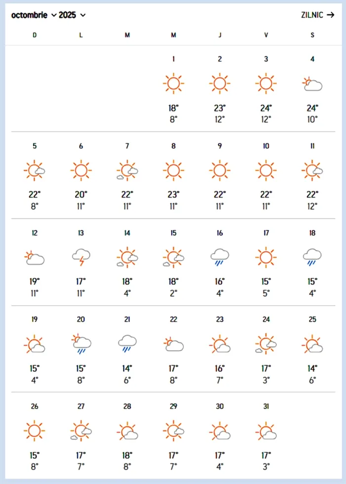 - 18 octombrie 2025: va ploua. Temperatura maximă va ajunge la 15 grade Celsius. Noaptea, valorile termice ajung la 4 grade.