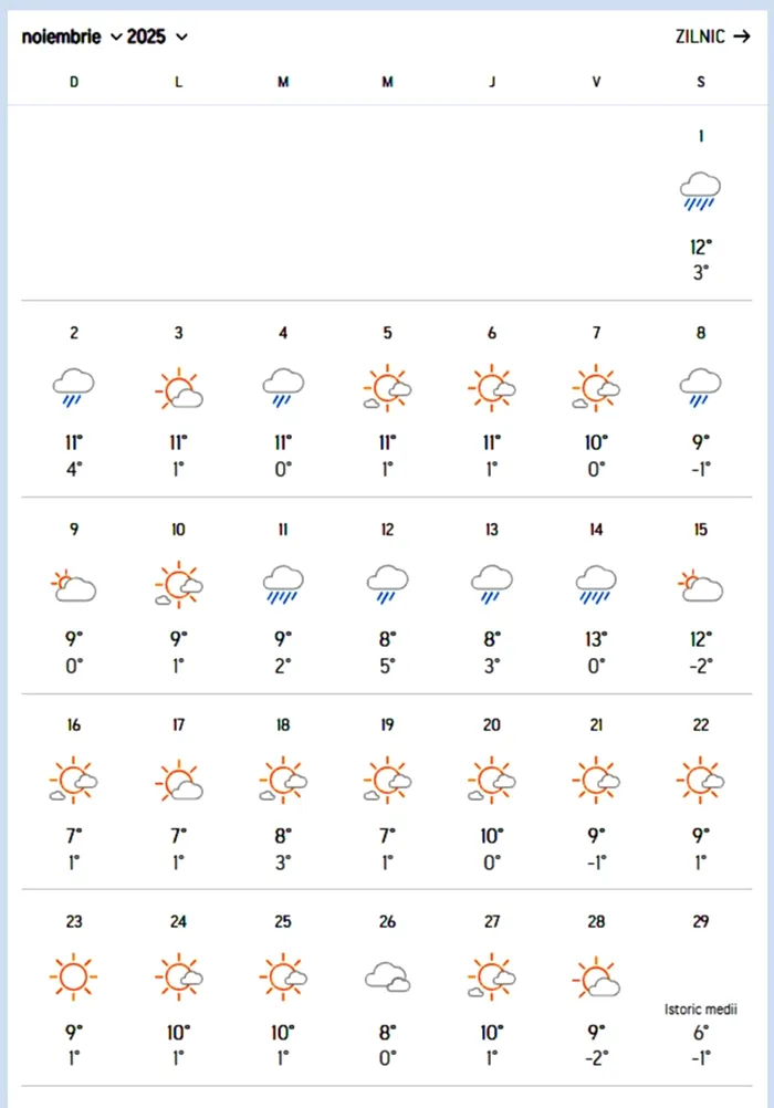 - 12 noiembrie 2025: va ploua. Temperatură maximă de 8 grade, temperatură minimă de 5 grade.