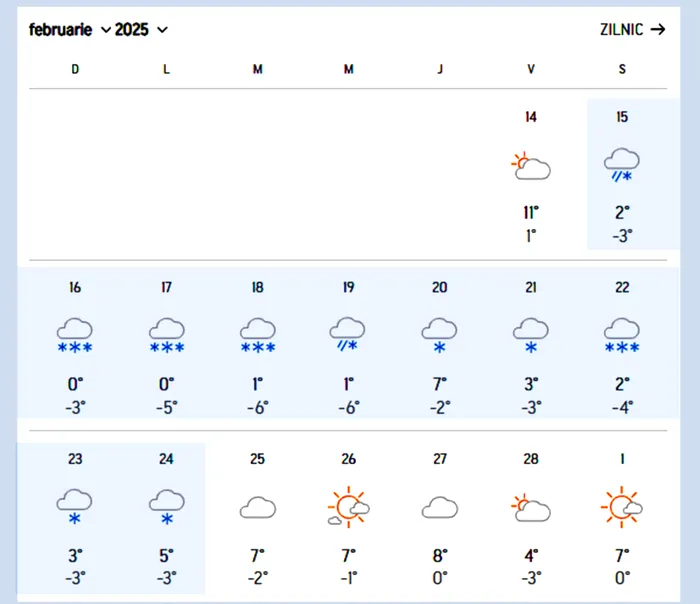 Conform exeperților AccuWeather în perioada 14-28 februarie 2025, se anticipează o perioadă în care vom avea parte de ninsori în fiecare zi.