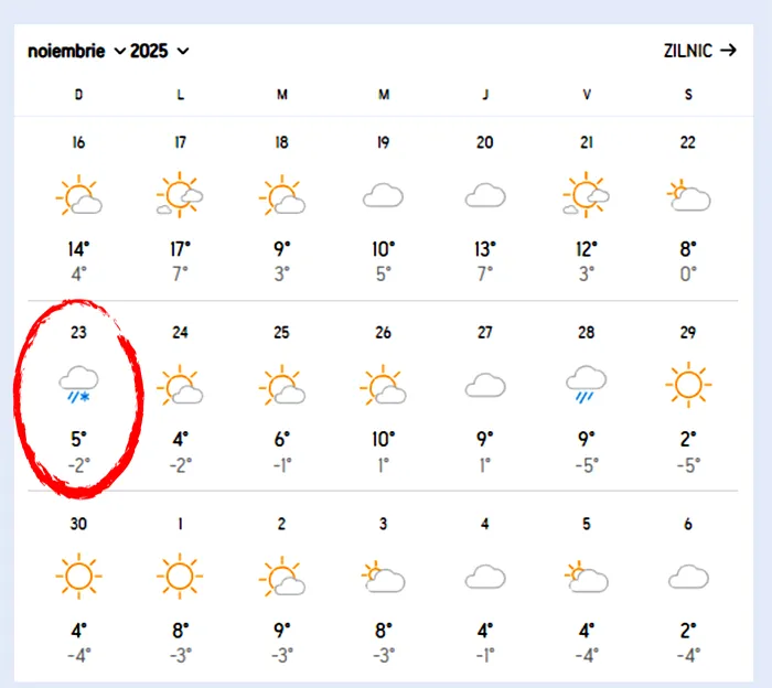 • 29 noiembrie 2025: temperatură maximă de 2 grade Celsius. Pe timpul nopții, temperatura va ajunge la -5 grade;