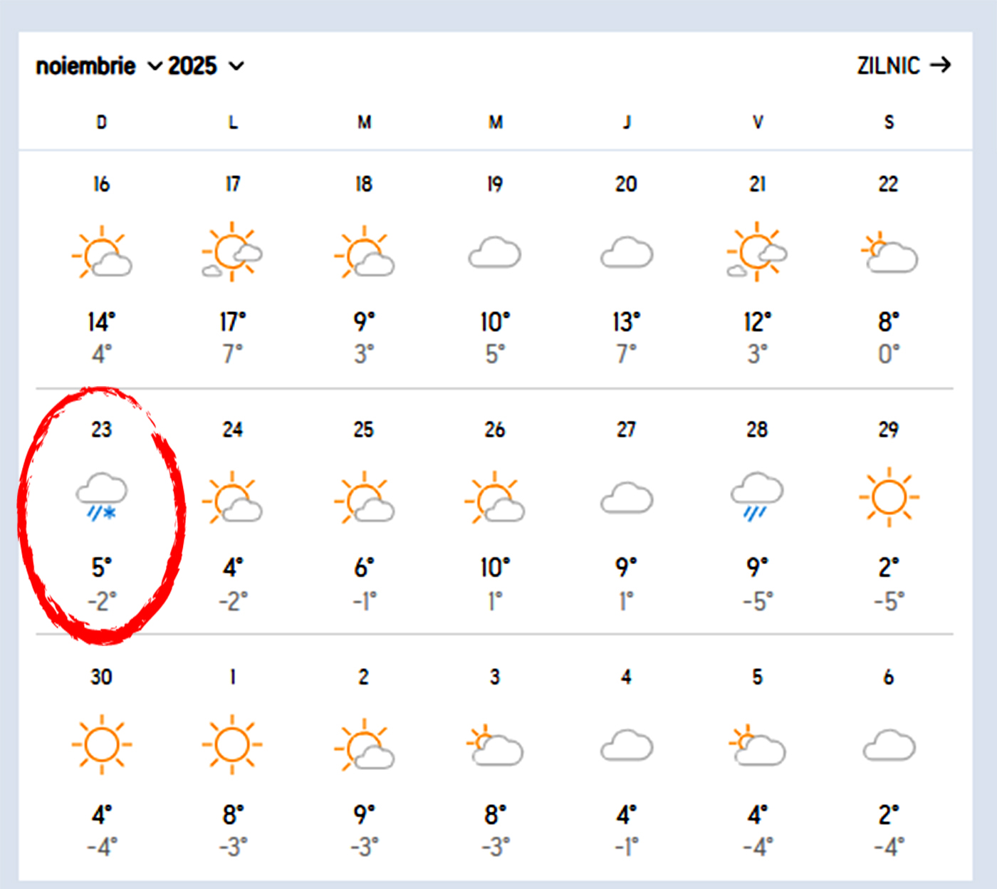 • 28 noiembrie 2025: va ploua. Temperatura maximă va fi de 9 grade Celsius. Noaptea, temperatura va atinge -5 grade Celsius;