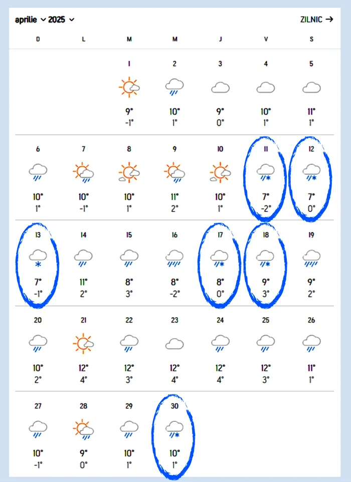 Și aprilie se anunță o lună capricioasă, cu temperaturi chiar și de 12 grade Celsius, dar și zile multe de …ninsoare. Va ninge șase zile la Predeal, conform sursei menționate, în datele de 12, 12, 13, 17, 18 și 30 aprilie. Iar ploile vor fi aproape nelipsite în această parte a țării.
