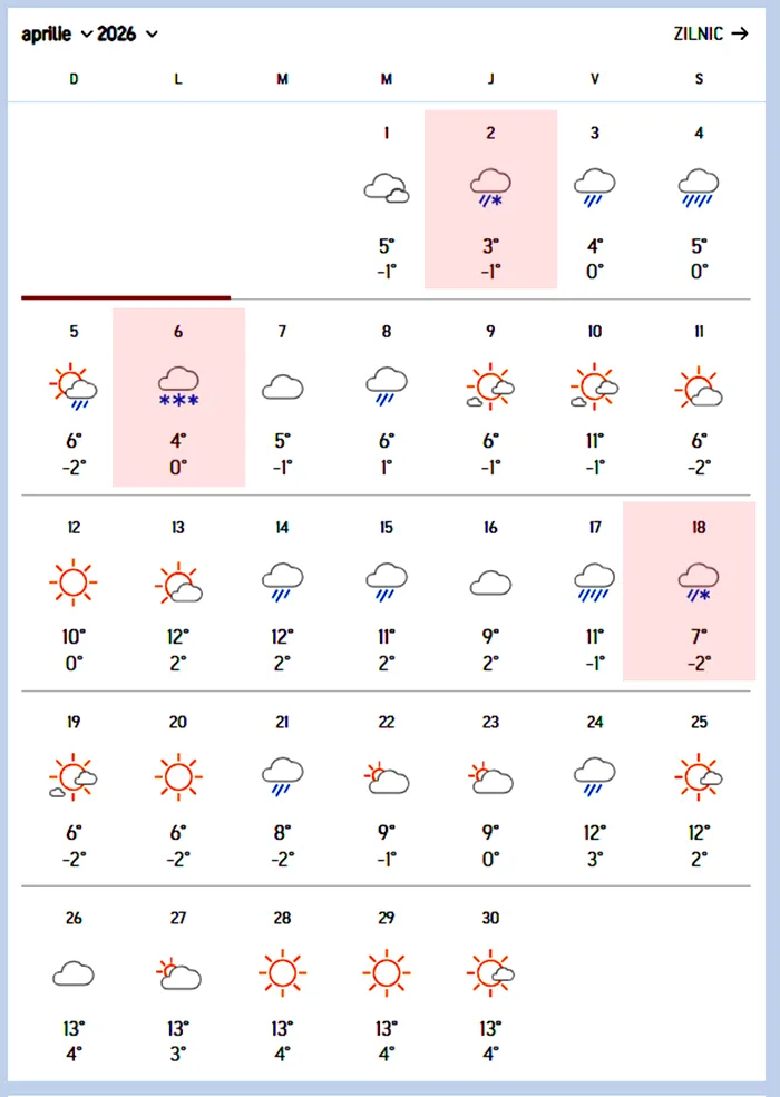 De altfel, prognoza pentru întreaga lună arată o alternanță constantă între episoade de frig și perioade mai calde. Meteorologii spun că trebuie să ne așteptăm la episoade de precipitații mixte (ploaie, lapoviță și ninsoare) în prima parte a lunii aprilie și, spre finalul perioadei, la o vreme frumoasă, temperaturi de peste 20 de grade și zile însorite.