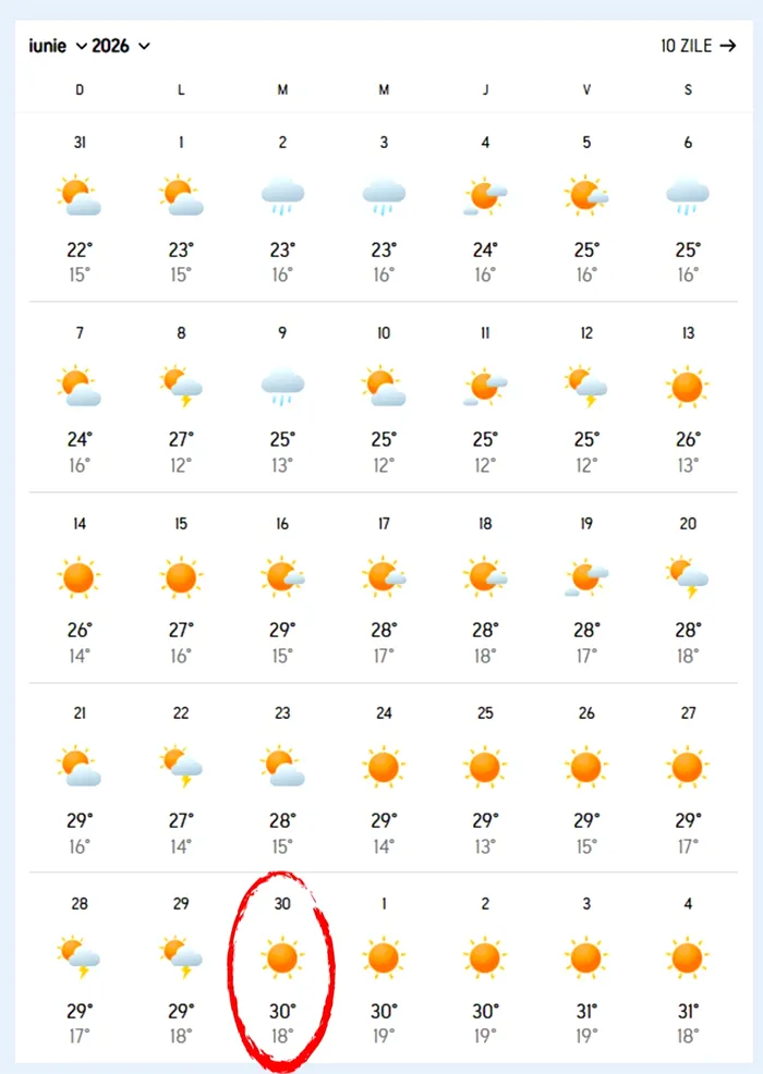 Abia în ultimele zile din lună, mai exact pe 30 iunie, meteorologii Accuweather estimează că vom avea 30 de grade Celsius. Din punct de vedere termic, acela va fi, practic, debutul verii.