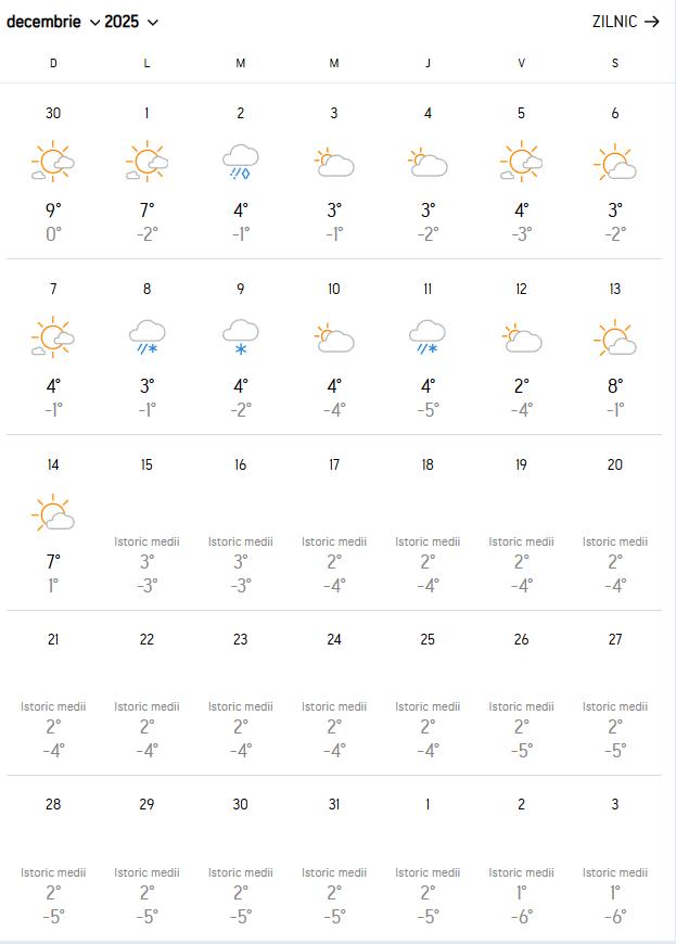 În decembrie vom trece, desigur, în zona cu temperaturi negative. Primele ninsori vor veni undeva în 8-11 decembrie, când vom avea 3 grade Celsius, anunță meteorologii Accuweather.