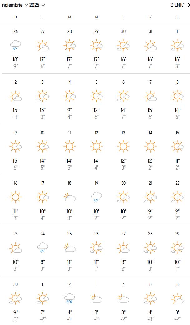 De asemenea, în noiembrie, temperaturile nu vor mai trece de 18 grade Celsius și vom avea chiar și 3 grade, spre sfârșitul lunii.