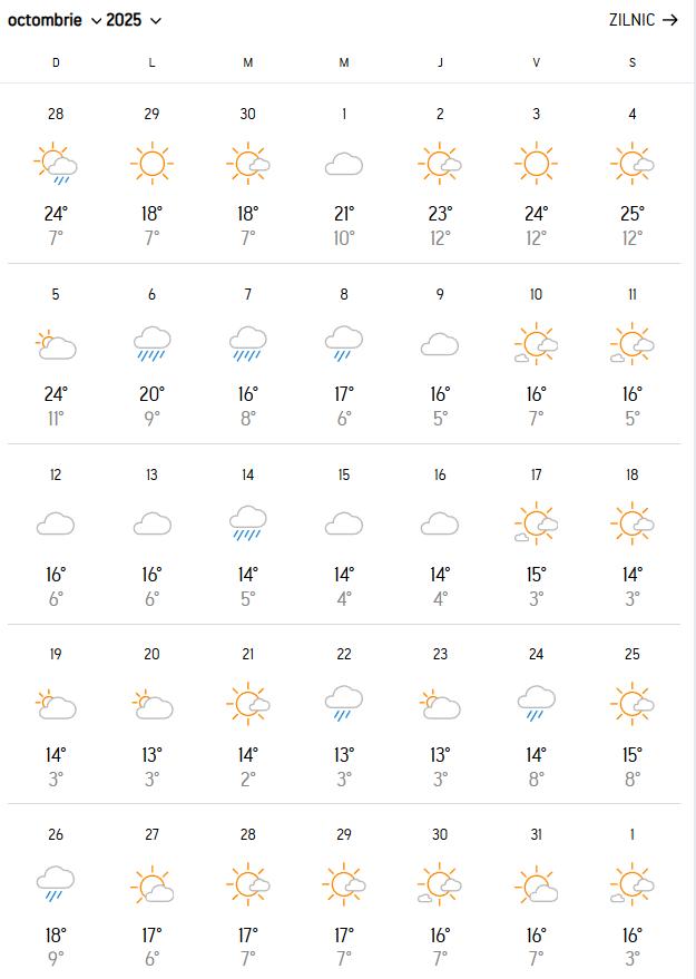 În octombrie 2025, situația se schimbă, cel puțin la nivelul Capitalei. Astfel, vom avea o primă săptămână cu ploi și temperaturile vor scădea până la 16 grade Celsius.