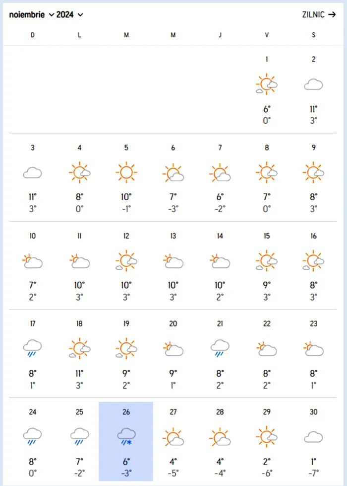 La o vizualizare amănunțită a prognozei, se poate observa că luna noiembrie vine o vreme oscilantă. Temperatura maximă care se va înregistra în Predeal, în luna lui Brumar, va fi de 11 grade Celsius. Temperatura minimă va atinge -7 grade Celsius, spre finalul lunii. În anumite zile, se vor înregistra ploi și lapoviță. Iată zilele în care se vor înregistra precipitații: