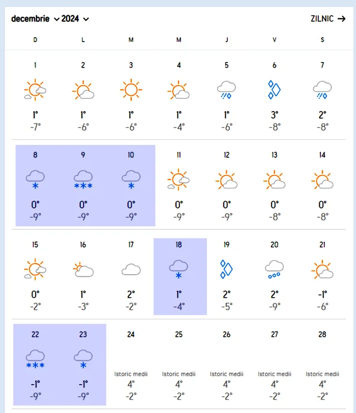 De altfel, vremea se schimbă în zona montană, în decembrie 2024. Dacă în luna noiembrie, temperaturile maxime treceau de 10 grade Celsius, în decembrie abia se va atinge o maximă de 4 grade Celsius. De altfel, meteorologii Accuweather anunță zile cu precipitații sub formă de lapoviță și ninsoare. Potrivit prognozei, în anumite zile se vor înregistra ninsori abundente în Predeal. În orașul montan, temperatura maximă, care se va înregistra în decembrie, va fi de 4 grade Celsius. Minima va coborî până la -9 grade Celsius, aducând nopți friguroase și geroase. Iată zilele când va ninge: