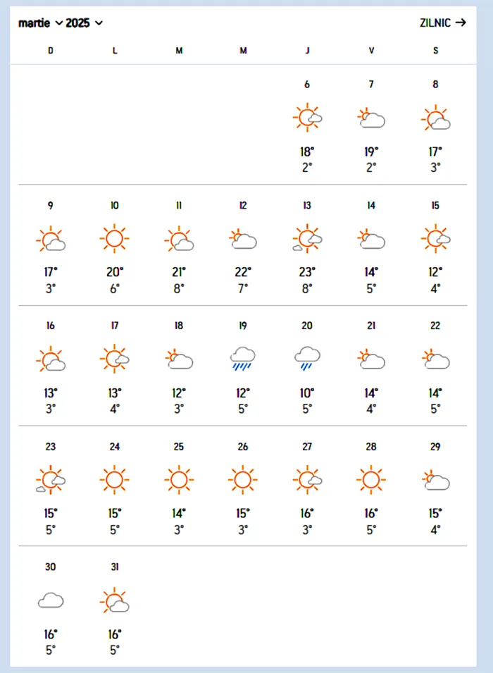Săptămâna 10…16 martie bate însă „recordul” la temperaturi pozitive, potrivit meteorologilor Accuweather și vom ajunge să ne bucurăm chiar și de 23 de grade Celsius în 13 martie.