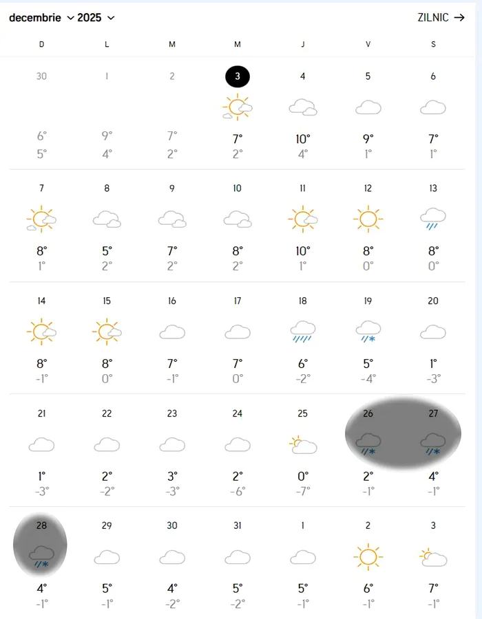 Ați ghicit, probabil, că este vorba de Brașov. Potrivit meteorologilor Accuweather, în orașul turistic va ninge începând cu 19 decembrie și se va opri, dar vor urma trei zile consecutive de ninsori, imediat după Crăciun, în zilele de 26, 27 și 28 decembrie.
