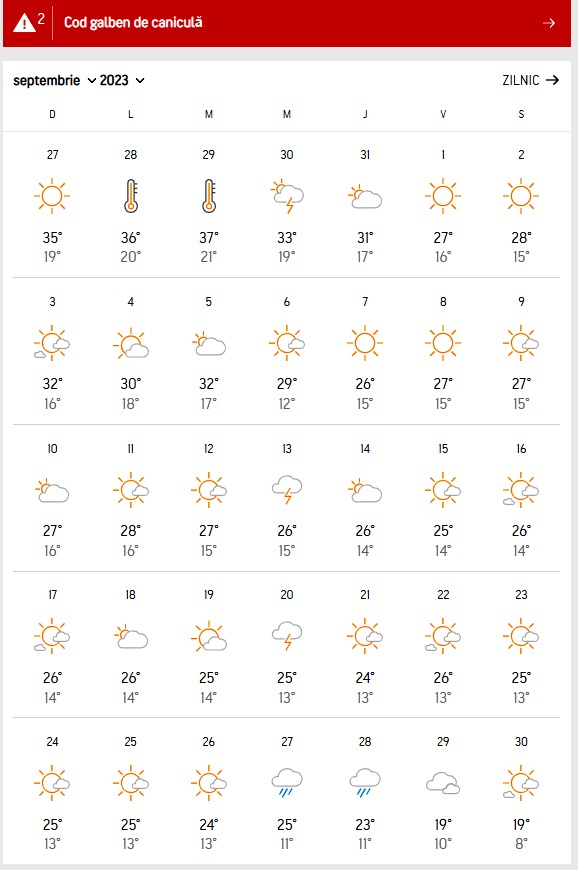 Astfel, prognoza pentru luna septembrie cuprinde și ultimele zile de vară, iar – conform acesteia – ultima alertă de canicula este emisă pentru data de 29 august (marți).
