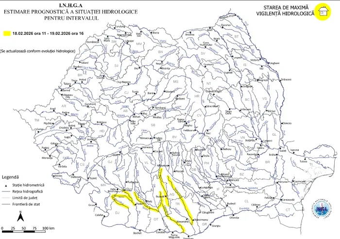 ” În intervalul 19.02.2026 ora 11:00 – 20.02.2026 ora 14:00 pe râurile din bazinele hidrografice: Călmăţui (judeţele: Olt și Teleorman), Vedea – afluenţii aferenţi sectorului aval S.H. Văleni (judeţele: Olt, Teleorman şi Argeş), Neajlov (judeţele: Argeș, Dâmboviţa, Teleorman și Giurgiu). Se ridică începând cu data de 19.02.2026 ora 11:00 Atenţionarea Hidrologică din celelalte bazine hidrografice avertizate anterior”, se menționează în comunicatul oficial emis.