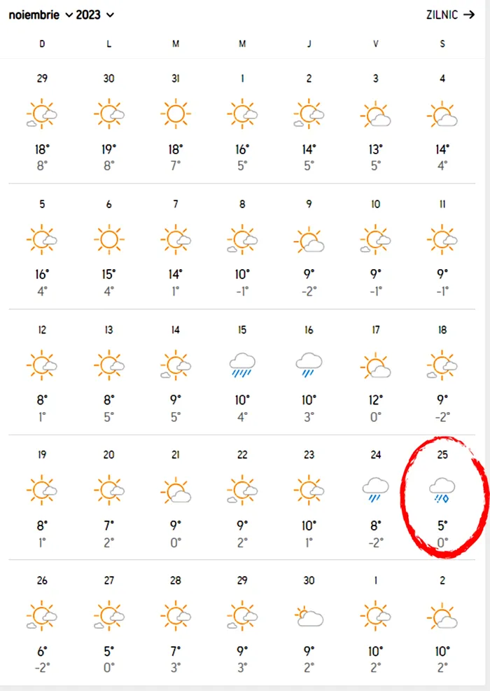 Conform prognozei pentru București, primii fulgi de nea, amestecați cu picături de ploaie, vor cădea în capitala României pe 25 noimebrie, moment când minima va fi de o grade Celsius și maxima de 5 grade.