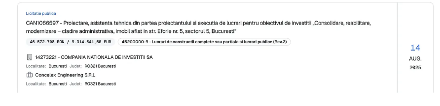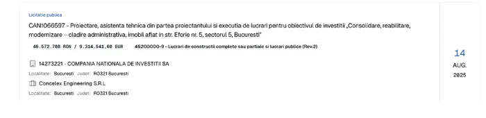 – 14 august 2025 – „Proiectare, asistență tehnică din partea proiectantului și execuția de lucrări pentru obiectivul de investiții „Consolidare, reabilitare, modernizare clădire administrativă, imobil aflat în str. Eforie nr. 5, Sectorul 5, București”. Valoarea contractului – 9.314.541, 60 euro.
