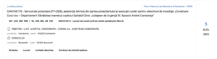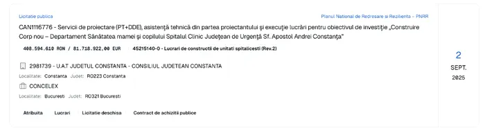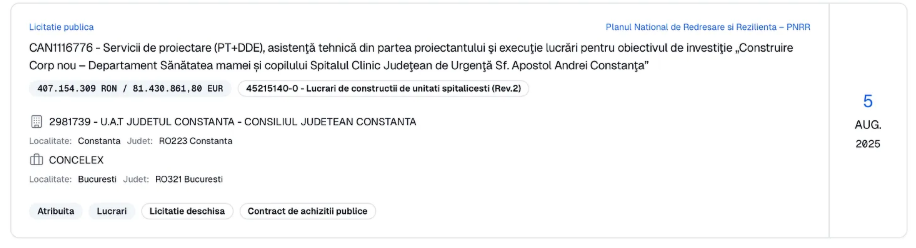 – 5 august 2025 – „Servicii de proiectare (PT + DDE), asistență tehnicădin partea proiectantului și execuție lucrări pentru obiectivul de investiție Construire Corp Nou – Departament Sănătatea mamei și copilului Spitalul Clinic Județean de Urgență Sf. Apostol Andrei – Constanța”. Valoarea contractului – 81.430.861, 80 euro.