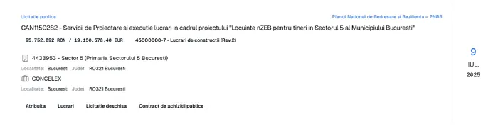 – 9 iulie 2025 – „Servicii de proiectare și execuție lucrări în cadrul proiectului „Locuințe nZEB pentru tineri în sectorul 5 al Municipiului București”. Valoarea contractului – 19.150. 578,40 euro.
