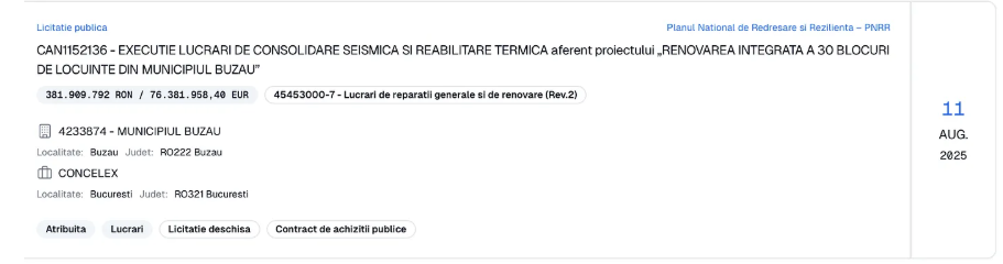 – 11 august 2025 – „Execuție lucrări de consolidare seismică și reabilitare termică aferent proiectului „Renovarea integrată a 30 de blocuri de locuințe din Municipiul Buzău”. Valoarea contractului – 76.381.958, 40 euro.