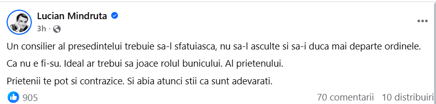 „Un consilier al președintelui trebuie să-l sfatuiască, nu să-l asculte si să-i duca mai departe ordinele. Ca nu e fi-su. Ideal ar trebui să joace rolul bunicului. Al prietenului. Prietenii te pot si contrazice. Și abia atunci stii ca sunt adevărați”, a scris jurnalistul pe Facebook, în contextul revocării lui Ludovic Orban, din calitatea sa de consilier prezidențial pe politică internă.