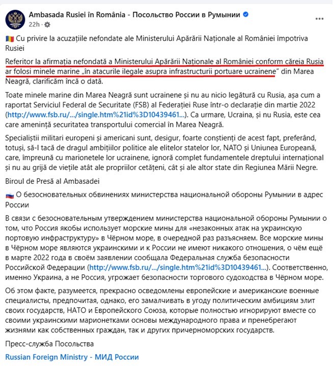 Este evident că, din analiza frazei citate, nu se sugerează în niciun fel că forțele ruse ar fi atacat porturile ucrainene cu mine marine. De asemenea, nu există nicio mențiune despre proveniența minelor marine care reprezintă o amenințare reală pentru traficul din Marea Neagră. În prezent, 107 mine au fost deja identificate și neutralizate de forțele navale ale statelor riverane”, se arată în reacția oficială a MApN.