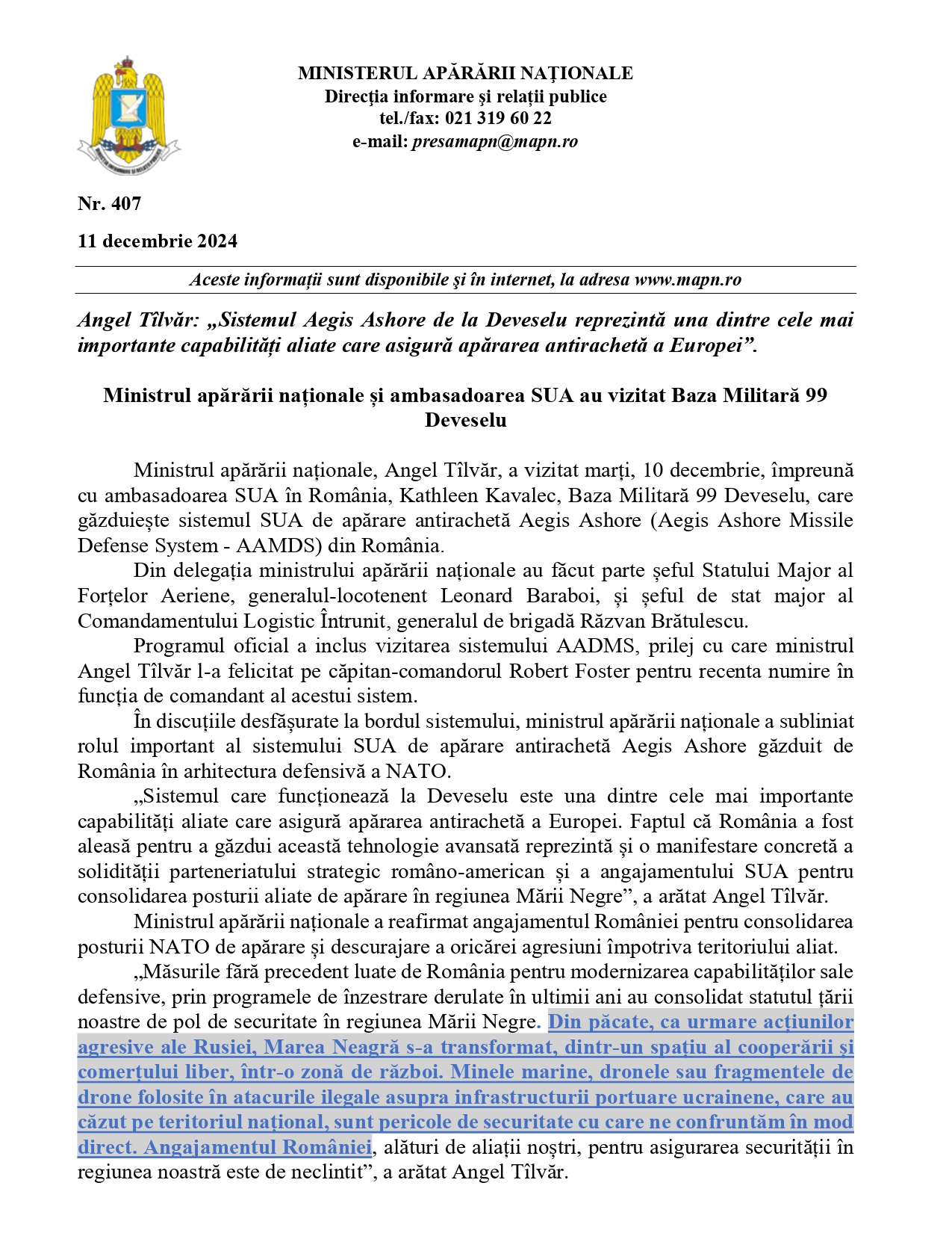 Într-un cominicat oficial, MApN susține că afirmațiile sale sunt complet justificate și subliniază faptul că „este cât se poate de clar cine a transformat regiunea Mării Negre într-un teatru de război”, cu consecințe grave pentru Ucraina și pentru securitatea regională.