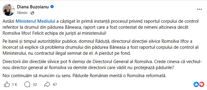 Prin intermediul unei postări pe pagina sa de Facebook, Diana Buzoianu a transmis că Ministerul Mediului a câștigat în primă instanță procesul privind raportul corpului de control referitor la drumul din pădurea Băneasa, care a fost contestat de Romsilva Ilfov.