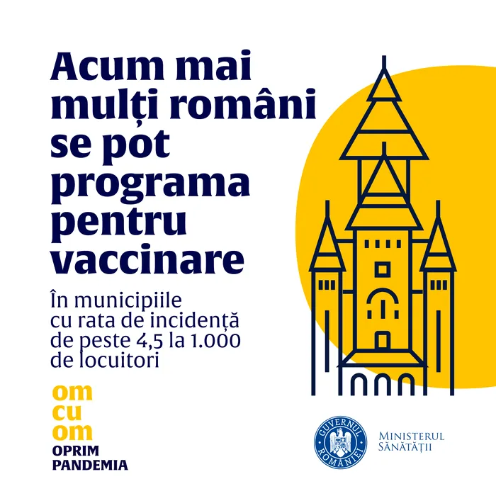 Un afiș al Ministerului Sănătății înfățișează imaginea locașului de cult fără cruci pe turle, în cadrul campaniei de vaccinare. Acesta anunță că românii care locuiesc în municipiile cu rată de infectare de peste 4,5 la mia de locuitori se pot vaccina mai repede.