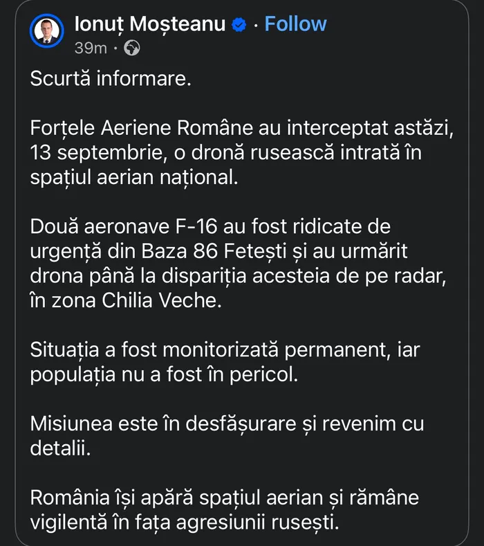 „Forțele Aeriene Române au interceptat astăzi, 13 septembrie, o dronă rusească intrată în spațiul aerian național. Două aeronave F-16 au fost ridicate de urgență din Baza 86 Fetești și au urmărit drona până la dispariția acesteia de pe radar, în zona Chilia Veche. Situația a fost monitorizată permanent, iar populația nu a fost în pericol. Misiunea este în desfășurare și revenim cu detalii. România își apără spațiul aerian și rămâne vigilentă în fața agresiunii rusești”, a scris ministrul pe Facebook.