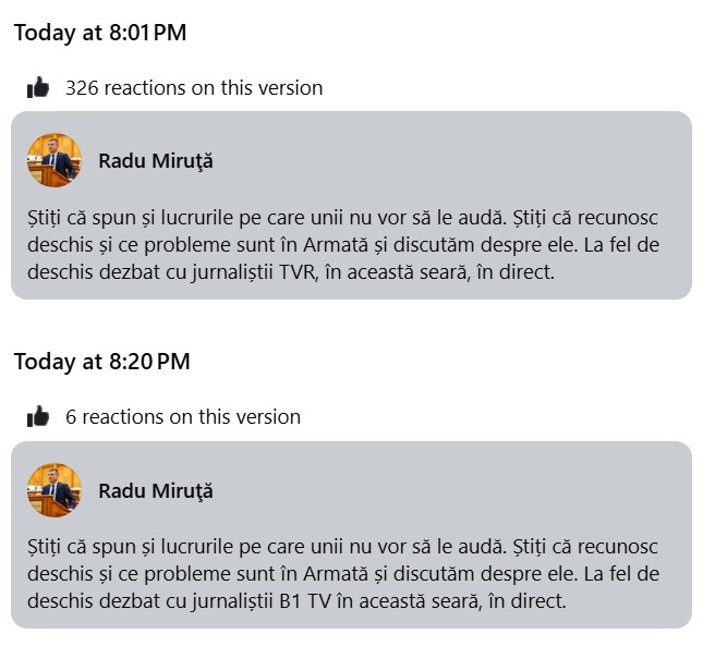 Imediat după ce a intrat în direct, pe contul de Facebook al lui Radu Miruță a și apărut o postare prin care era anunțată prezența ministrului în studioul „TVR”.