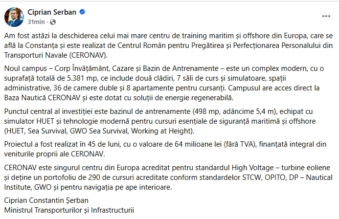 Ciprian Șerban a transmis că proiectul a fost realizat în 45 de luni: ”Proiectul a fost realizat în 45 de luni, cu o valoare de 64 milioane lei (fără TVA), finanțată integral din veniturile proprii ale CERONAV. CERONAV este singurul centru din Europa acreditat pentru standardul High Voltage – turbine eoliene și deține un portofoliu de 290 de cursuri acreditate conform standardelor STCW, OPITO, DP – Nautical Institute, GWO și pentru navigația pe ape interioare”, a încheiat ministrul Transporturilor.