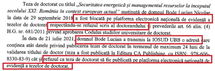 Contactat de G4Media, directorul Institutului de Studii Doctorale de la UBB, profesorul universitar Zoltan Neda, a explicat că anunțul a fost motivat de o adresă trimisă de Bode în aceeași zi, pe 21 iulie, document care conținea ”refuzul ca teza de doctorat să fie publicată pe platforma electronică națională de evidență a tezelor de doctorat.”