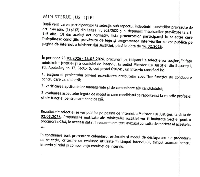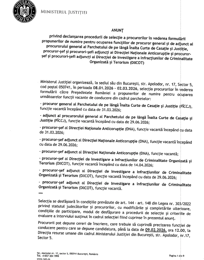 Selecția procurorilor se va desfășura în perioada 8 ianuarie – 2 martie 2026, în vederea formulării de către Ministrul Justiției, Radu Marinescu, către Președintele României, Nicușor Dan, a propunerilor de numire la șefia marilor parchete.