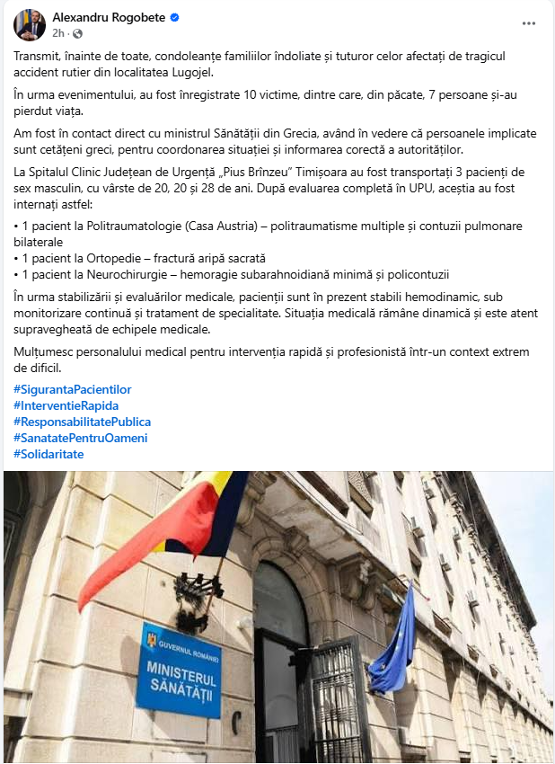 „Transmit, înainte de toate, condoleanţe familiilor îndoliate şi tuturor celor afectaţi de tragicul accident rutier din localitatea Lugojel. În urma evenimentului, au fost înregistrate 10 victime, dintre care, din păcate, 7 persoane şi-au pierdut viaţa. Am fost în contact direct cu ministrul Sănătăţii din Grecia, având în vedere că persoanele implicate sunt cetăţeni greci, pentru coordonarea situaţiei şi informarea corectă a autorităţilor”, a transmis Alexandru Rogobete.