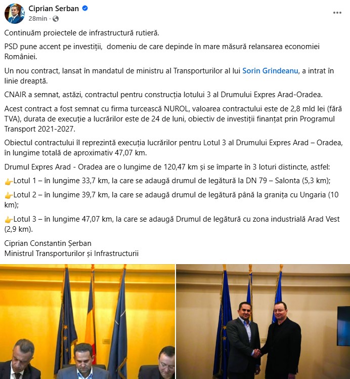 Printr-o postare pe pagina sa de Facebook, Ciprian Șerban a anunțat că CNAIR a semnat astăzi contractul pentru construcția lotului 3 al Drumului Expres Arad-Oradea.