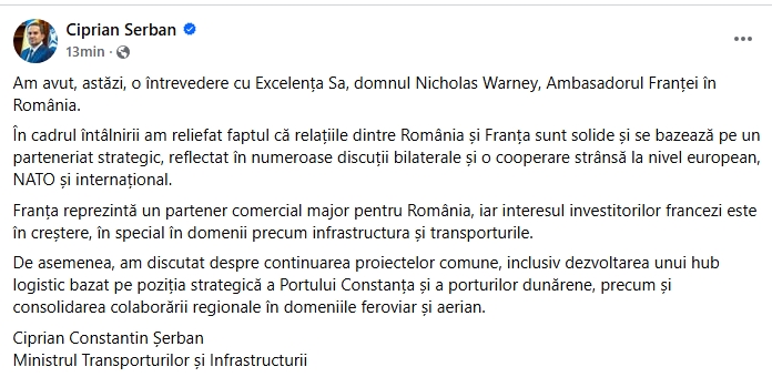 Prin intermediul unei postări pe pagina sa de Facebook, Ciprian Șerban a anunțat că s-a întâlnit cu ambasadorul Franței, Nicholas Warney.