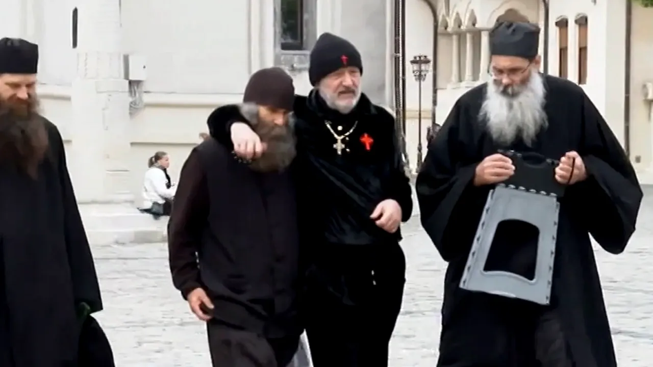 Gigi Becali a ieșit de la slujba de Sfântul Gheorghe pe ușa cea solemnă a preoților, rar folosită de păcătoși de rând. Înveșmântat în catifea neagră și accesorizat cu semnul crucii în trei exemplare, la cât în piept și pe fes. Latifundiarul l-a luat după ceafă pe unul dintre călugări ca pe un camarad de misiune. Și au pășit împreună spre camera de filmat.