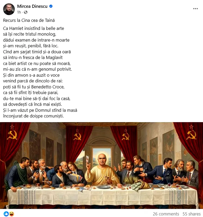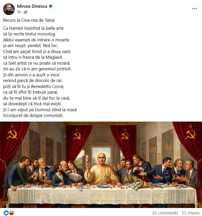 În dreptul postării sale, Mircea Dinescu a încărcat și o imagine generată cu Inteligența Artificială care face trimitere la Cina cea de Taină. În mijloc este înfățișat, de pildă, în acest caz, Ilie Bolojan.