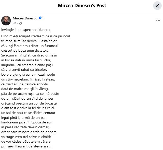 Mircea Dinescu a postat recent pe pagina sa de Facebook un text sub forma unei poezii. Textul este intitulat „Invitație la un spectacol funerar”.