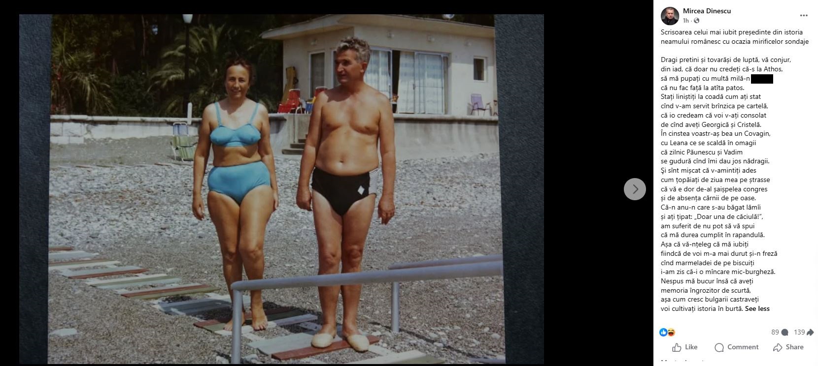Mircea Dinescu dezvăluie scrisoarea lui Nicolae Ceaușescu către popor. În dreptul ei, a încărcat și o imagine cu Elena Ceaușescu și soțul ei din perioada în care se aflau la malul Mării Negre.