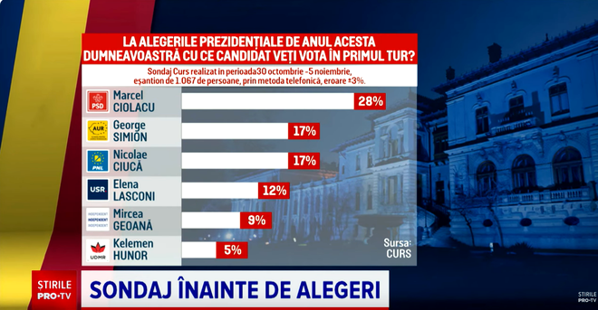Sondajul CURS, realizat în perioada 20 octombrie – 5 noiembrie și difuzat de platformele media „influente”, de la ProTV la HotNews, îl plasează pe candidatul liberal Nicolae Ciucă la egalitate cu George Simion, liderul AUR, ambii fiind cotați cu un scor de 17% în intențiile de vot, dacă alegerile prezidențiale ar avea loc acum.