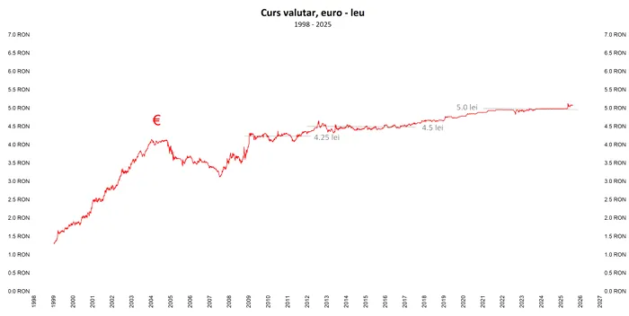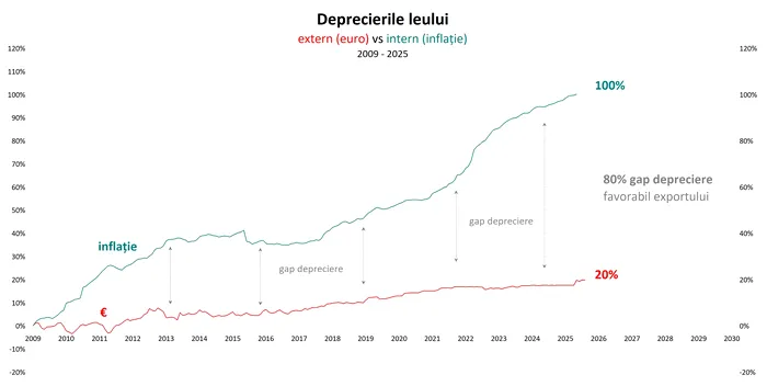 Din 2009 până în 2025, deci, cursul valutar leu – euro a scăzut de la 4,25 la 5,0. Adică o depreciere de 20%. În timpul ăsta, din 2009 încoace, inflația a dus deprecierea leului la 100%.