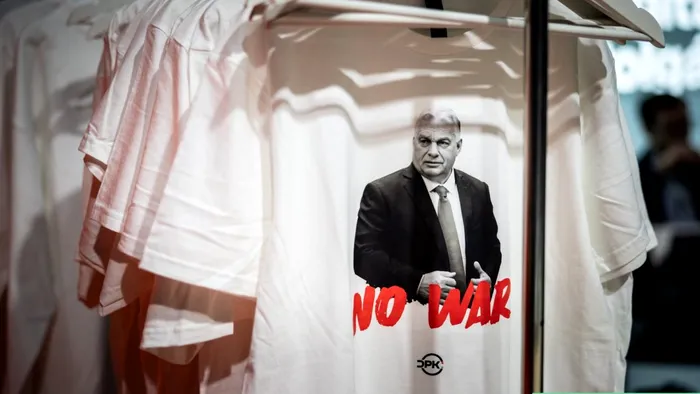 Șepci și tricouri cy chipul lui Viktor Orban la un mintig anti-război. Foto: 24hu