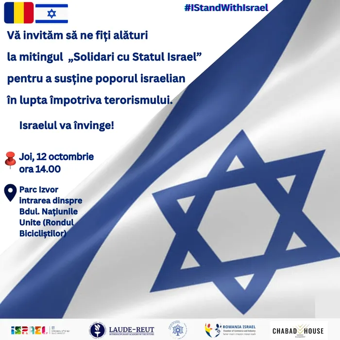 „Vă rugăm să ne fiți alături la mitingul „Solidari cu Statul Israel” pentru a susține poporul israelian în lupta împotriva terorismului. Israelul va învinge!”, a transmis Ambasada Israelului la București.