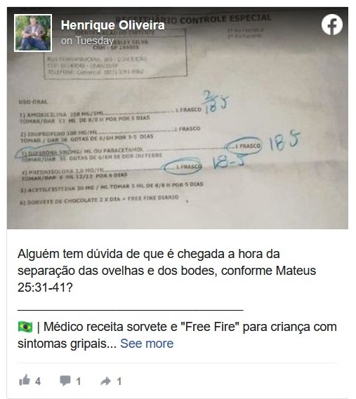 Pe lângă rețeta pe care trecuse medicamente, medicul a adăugat și înghețata de ciocolată și „Free Fire”, un joc de acțiune disponibil pe smartphone-uri.