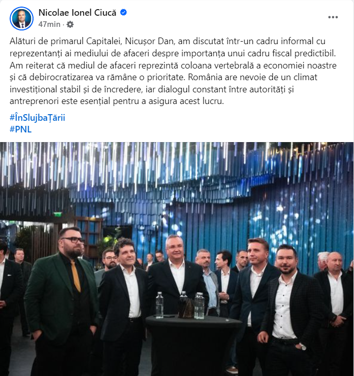 „Alături de primarul Capitalei, Nicușor Dan, am discutat într-un cadru informal cu reprezentanți ai mediului de afaceri despre importanța unui cadru fiscal predictibil. Am reiterat că mediul de afaceri reprezintă coloana vertebrală a economiei noastre și că debirocratizarea va rămâne o prioritate. România are nevoie de un climat investițional stabil și de încredere, iar dialogul constant între autorități și antreprenori este esențial pentru a asigura acest lucru.”, a scris Nicolae Ciucă pe Facebook.