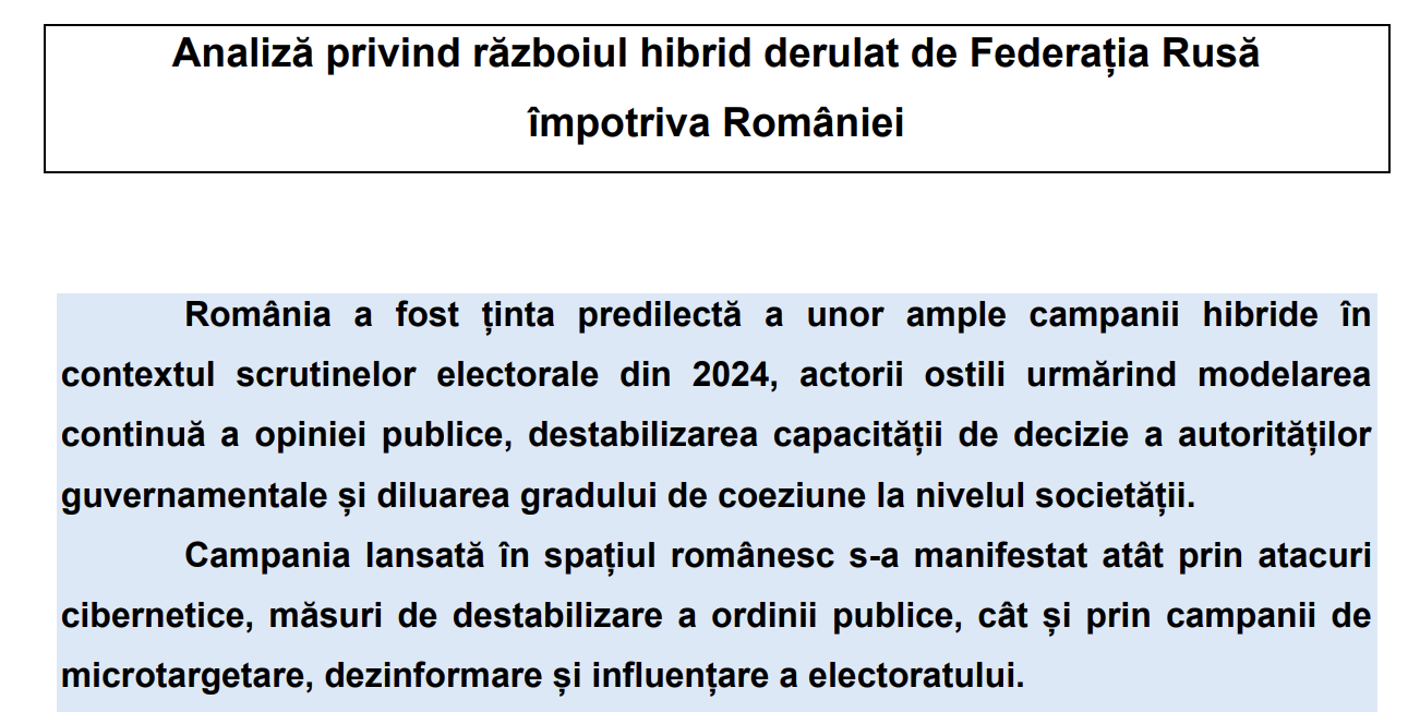 „Începând cu anul 2022, infrastructura din România a făcut obiectul constant al unor ample atacuri cibernetice, coordonate de actori din Federația Rusă. Directoratului Național pentru Securitate Cibernetică, instituția din România dedicată securității cibernetice, prezintă constant alerte și avertizări privind atacurile înregistrate asupra infrastructurii critice a țării în spațiul virtual”.